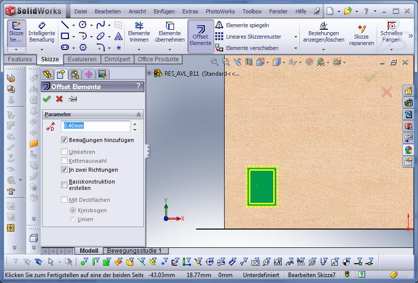 SWX erstellt nun ein Abbild der ausgewählten Fläche und verschiebt die Außenränder 2mm nach außen – klingt praktisch, ist es auch. Bestätigen und man hat mit 3 Klicks und einer Zahleneingabe die Skizze für das nächste Feature fertig.