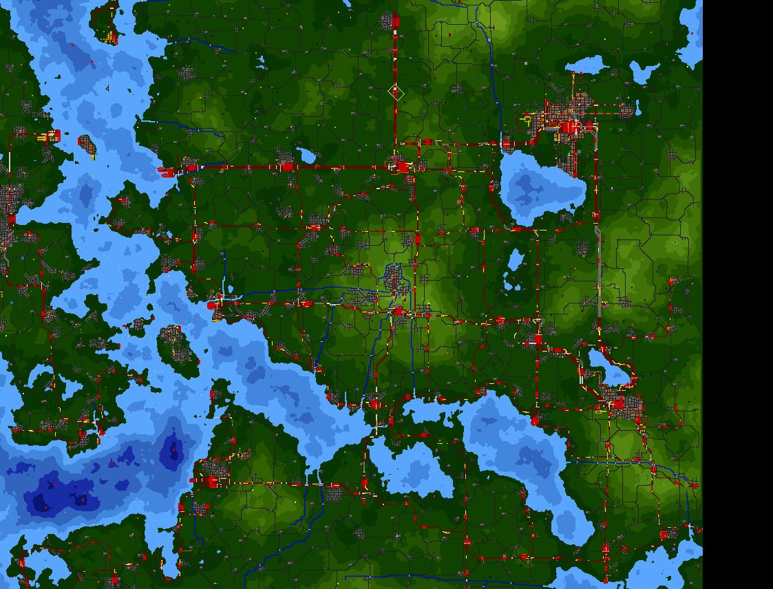 Hier sieht man einen regionalen Knotenpunkt im Süden der Karte und die Kartenübersicht, an der ich gerade sitze. Natürlich habe ich nicht bei jedem Ort die Bebauung selbst abgestimmt (bei einer 64er Karte hatte ich das mal gemacht, aber dafür braucht man schon 'nen sehr langen Atem), dafür habe ich auf Realismus bei den Verkehrsflächen immer viel Wert gelegt.