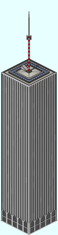 "Liebling, ich hab den WTC-Turm geschrumpft!" ist wohl die beste Beschreibung dieses schön ausgearbeiteten Turms. Die WTC-Türme waren bei ihrer Vollendung monumental (wenn nicht sogar episch) in ihrer Erscheinung. Auf die Simutrans-Welt übertragen erwartet man daher einen Turm, der auf vier Kacheln ruht (was zurzeit nicht möglich ist, ich weiß).