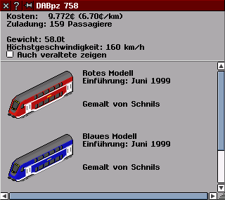Die Idee dient dazu, alternative Grafiken für den gleichen Wagen zu ermöglichen, genau ohne dass die Balance durch eigene Wertevergabe gestört wird und ohne dass das Depot überbevölkert wird. Unterschiedliche Werte bei zwei Zügen gleicher Baureihe zu verwenden ist eher selten sinnvoll, aber wenn die Werte beim gleichen Modell tatsächlich aus irgendwelchen Gründen unterschiedlich sind, so haben sie damit wohl auch das Recht erworben, eigene Einträge im Depot zu bekommen. Wie das mit japanischen Zügen unterschiedlicher Lackierung funktioniert weiß ich nicht - sind die variierenden Werte an reale Vorgaben angepasst oder "einfach nur so" für mehr Vielfalt?