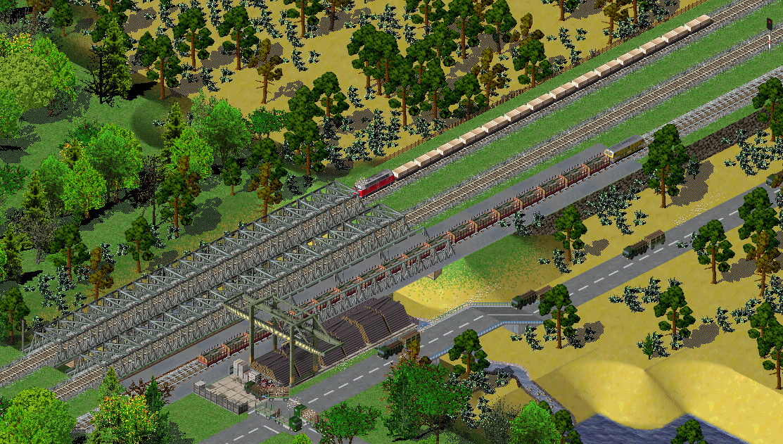 Wohin mit den angelieferten Rohstoffen? Die Unternehmen im PAK128.german-Universum finden gute Bedingungen vor. Hier etwa ein Stahlwerk, das an seiner Ostseite Koks, Erz und Schrott lagert. Im Norden wird ebenfalls über einen Portalkran Schrott angenommen und gelagert, im Westen wartet der fertige Stahl auf Abtransport. Die Grafiken stammen von RedRabbit.