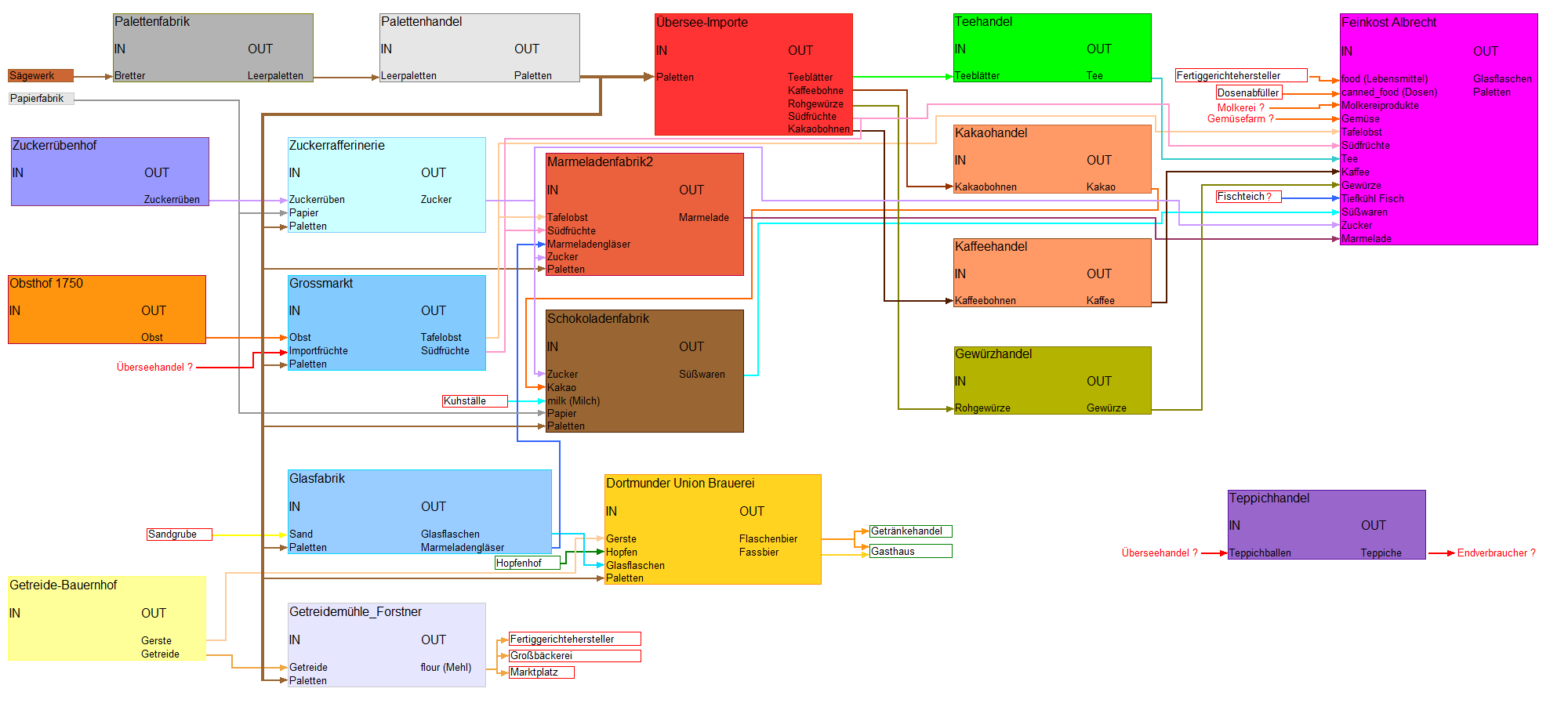leider hatte das nicht gereicht. Danach fehlten noch "Leerpaletten" ,"Molkereiprodukte" und "Tiefkuehl Fisch". Hab jetzt die fehlenden Sachen doch selbst erstellt. Erstmal nur mit Platzhaltern. Nun läuft es und ich bin seit ein paar Stunden mit rumprobieren beschäftigt. Der Ersteindruck ist ganz nett, die Gebäude sehen alle ganz lustig aus. Ich weiß das die Industrieketten noch nicht richtig ausgereift sind, aber ein paar Sachen sind doch schon irgendwie komisch. Was ist der Unterschied zwischen Leerpaletten und Paletten, und wie macht der Palettenhandel das? Und ich kann kein Tafelobst im Feinkost Albrecht verkaufen, weil stattdessen Paletten wieder zum Großhandel geliefert werden. Trotzdem nicht schlecht.