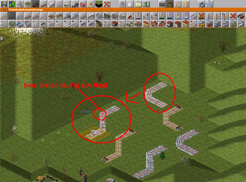 Beim Entfernen von Straßen, Schienen und beim schräg bauen bleiben Reste des alten Objekts stehen, die dann mit dem Cursor "weggeschmiert" werden können. Besonders auffällig ist das bei der Monorail, wo ganze Kaskaden stehen bleiben. Aus- und Einscrollen erledigt den Fehler.