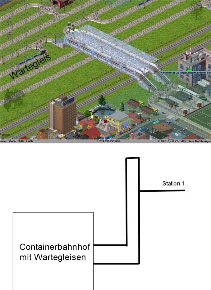 Wenn das Problem nun darin besteht, dass Züge, die auf ihre Ladung warten, den Bahnhof komplett blockieren, dann kann das Auswahlsignal nur helfen, wenn mehr Gleise als solche Züge vorhanden sind. Mögliche Alternative also: längere Züge und Bahnhöfe - das geht nicht direkt, daher: den Bahnhof auf eine andere Ebene verlegen, unterirdisch oder (naheliegender) auf die Brücke selbst. Ggf. Ctrl/Strg-Taste beim Bauen und bei der Fahrplanerstellung verwenden.