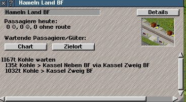Wenn aus einer z.B. Kohlemine 2 Kraftwerke beliefert werden, dann werden ja auch 2 "Kohlelieferungen" erzeugt, leider werden diese immer in der gleichen Reihenfolge abgearbeitet. Das heißt wenn ich in der Zeit die der Zug vom Abholen zum wegbringen und zurrückfahren (also hin+zurrück) nur soviel produziere wie der Zug laden kann, ich nie die andere Lieferung anfassen kann, hier wäre es schöner, wenn man die abholreihenfolge beeinflussen könnte. Beispiel: 200Kohle->Kiel HB + 200 Kohle Münster HB. Beide liegen auf derselben Strecke, der Zug fasst 100. Dann sähe es nach dem ersten mal so aus: 200 Kiel HB + 100 Münster HB. Der Zug fährt los, kommt wieder an, nun ists wieder 200/200 er nimmt dann wieder nur MünsterKohle mit. Die KielKohle würde nie angefasst werden. Es wäre schöner wenn er 50/50 mitnehmen würde, oder aber mal das eine mal das andere.