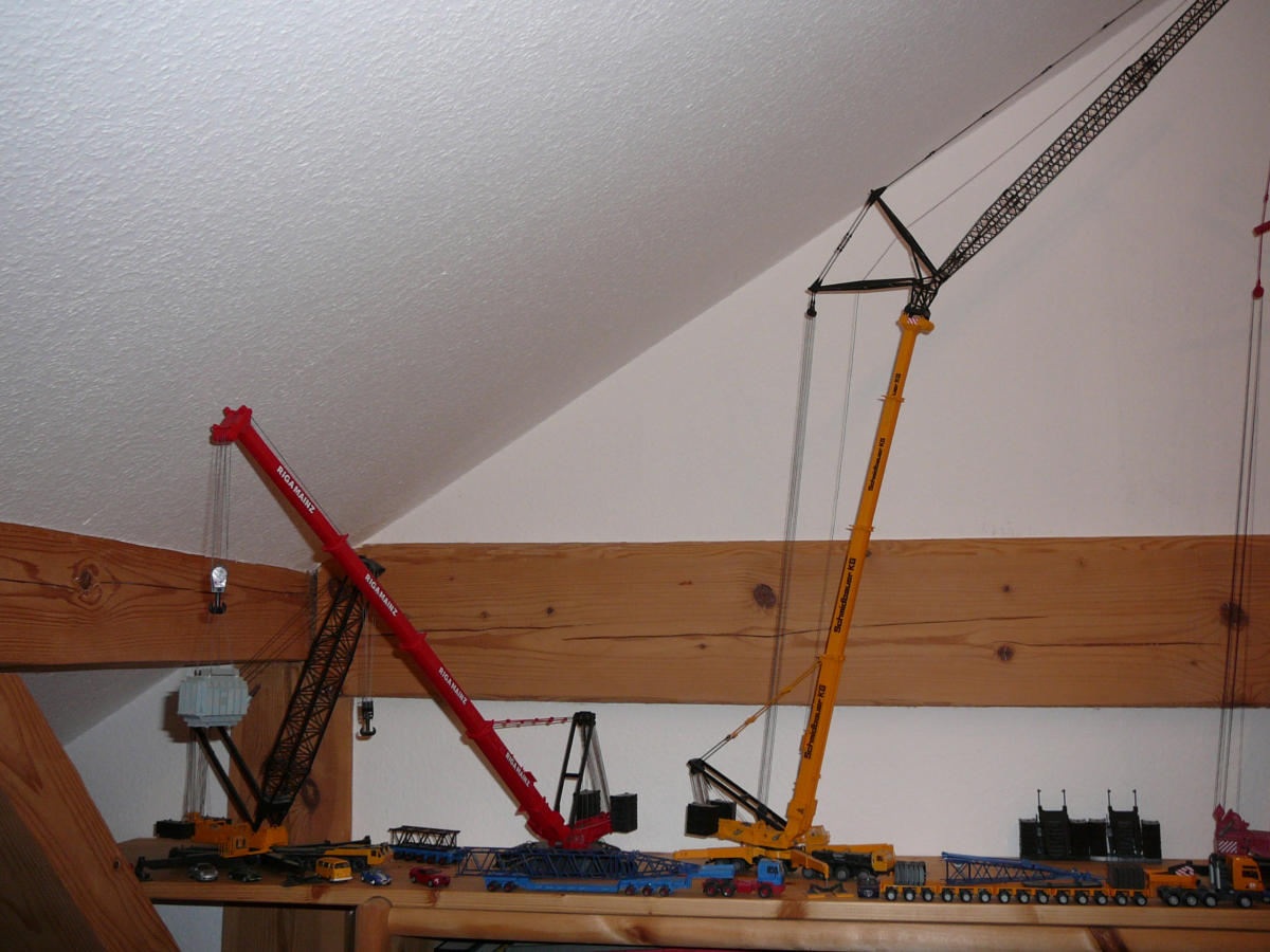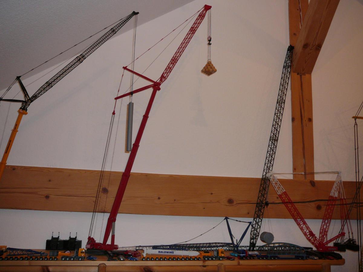Der rote Teleskopkran ist ca. 1,1m hoch, was im Original ungefähr 96m entspricht. Der schwarze Gittermast ist für einen ungefähr 1,6m hohen Kran (Original 140m).