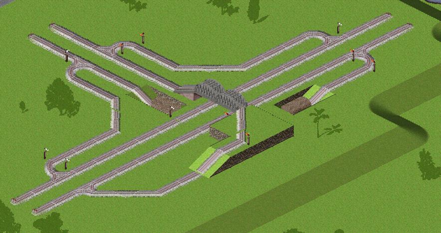 Ich meine trotzdem, dass dein Hauptproblem mit den Staus nicht die Strecke, sondern eher die Kreuzungen sind. Ich hab dir mal einen Screenshot beigehaengt, wie man ein T bauen kann, ohne dass beim Abbiegen eines Zuges der gesamte Gegenverkehr gestoppt wird. Das bringt wirklich eine ganze Menge!