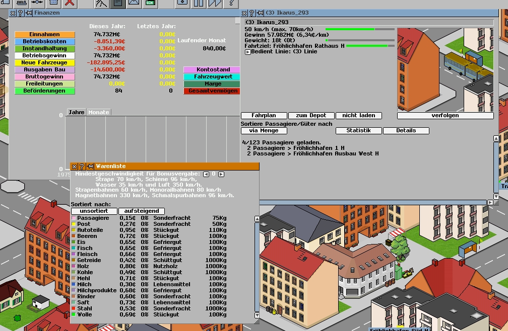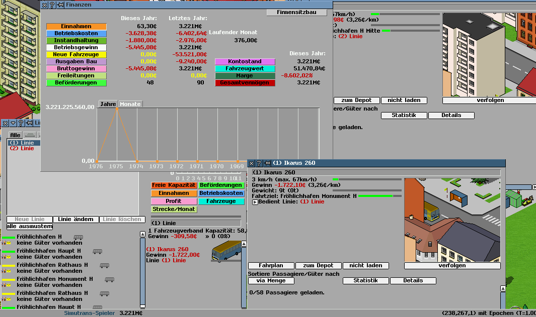 Fehler (möglichst genaue Beschreibung): Nachdem ich ein neues Spiel mit P192C angefangen habe, eine große Stadt mit Bushaltestellen versorgt und 3 Busse auf einer völlig unausgelasteten Linie fahren ließ, hatte ich nach einer 1 Minute im Schnelllauf ein Sprunghaftes Vermögen, nach dem Transport von 84 Passagieren, aufgebaut. (75 Millarden)