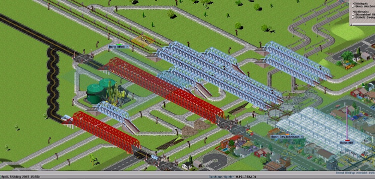 Hallo zusammen, habe gerade eine ziemlich komplizierte Kreuzungen kreuzungsfrei gemacht... Dachte ich lasse euch mal daran teilhaben. Es handelt sich hierbei um eigentlich 4 Kreuzungen, die so nahe beieinander waren, dass es ein ziemliches "gewusel gegeben hat. Naja, beisst euch mal die Zähne aus, wozu welches Gleis gedacht ist. Kleiner Tip, kein Gleis ist nutzlos =)