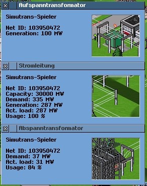 Es gibt 3 verschiedene Anzeigen für die Stromnetze. Erzeugung (oben), Transport (mitte) und Verbraucher (unten)