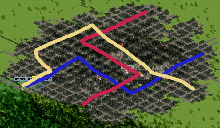 Gelb würde ich auf -1 unterm Stadtgebiet fahren lassen, Blau auf -2 und Rot hätte dann einen Höhensprung drinnen