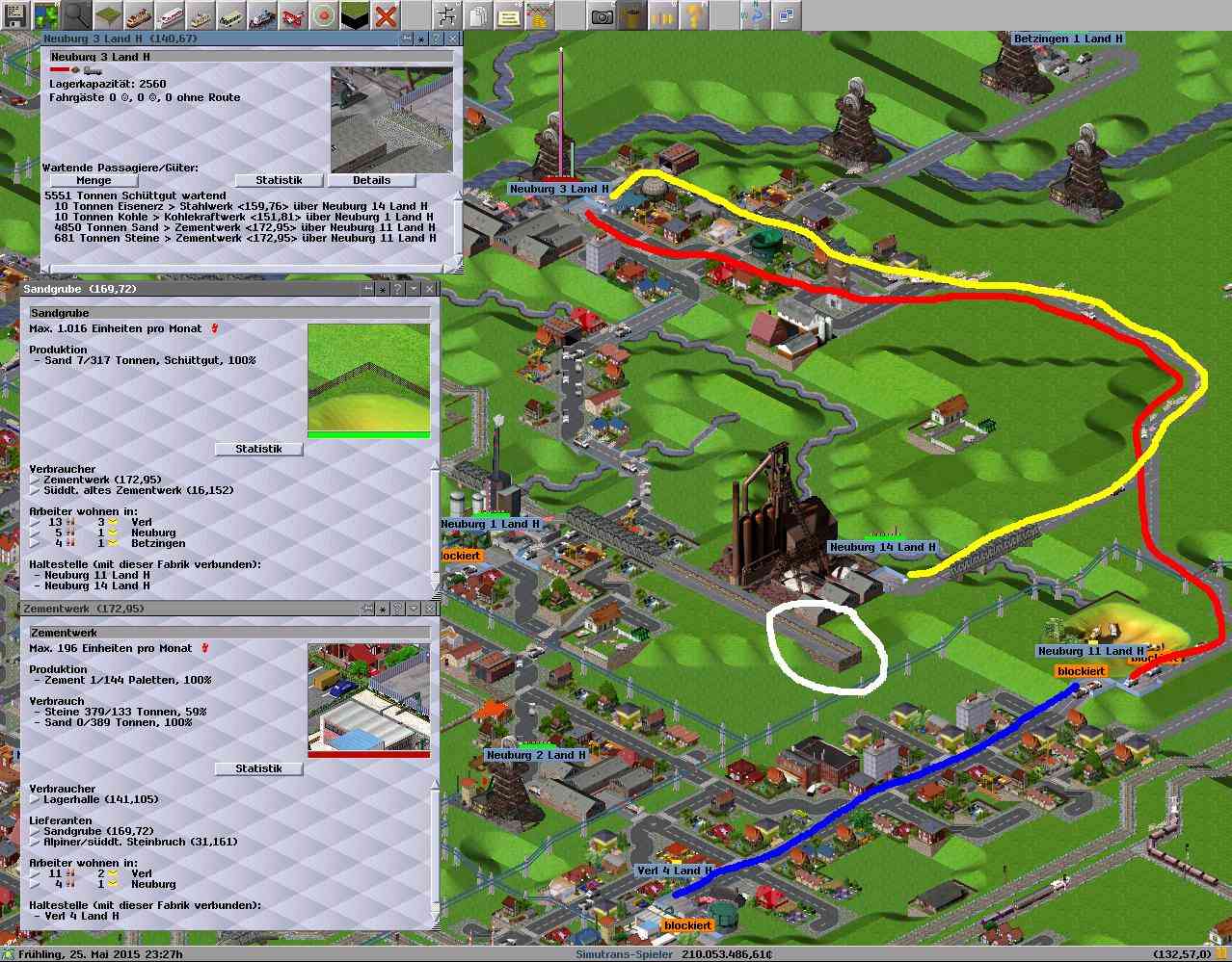 Dadurch hat die Sandgrube ihren Sand an die HS N14LH abgegeben und der Sand soll nun über die "gelbe"-"rote"-"blaue" Linie zum Zementwerk transportiert werden.