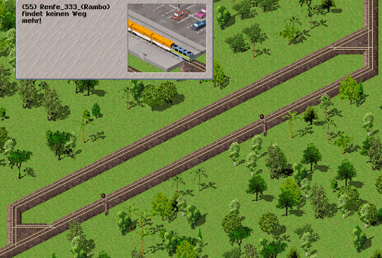 Edit: Jetzt wirds immer seltsamer: Ich habe mal die ganze neuralgische Strecke mit freien Wegpunkten im Fahrplan gepflaster und jetzt fährt der Zug bis zur Zusammenführung und dann gibts 'keine Route'. Siehe Bild 2. Ich dachte kurz an fehlende Stromschiene, iss es aber nicht.
