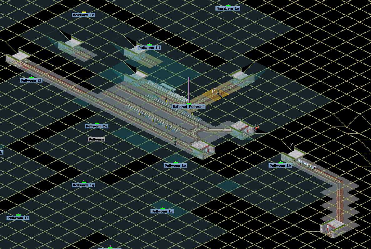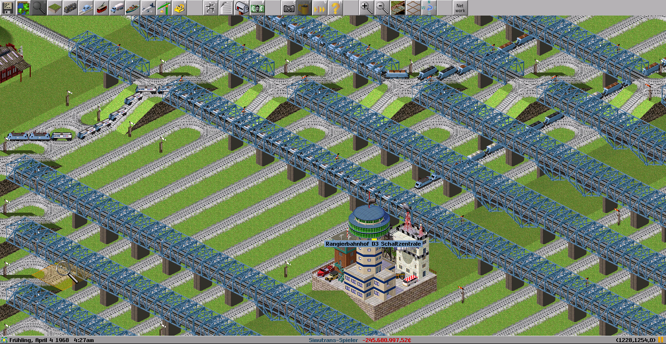 Eigentlich könnte man mit Überwerfungsbauwerken einen Kopfbahnhof stark verbessern, aber jede Steigung bremst in Simutrans die Züge extrem aus, daher muss man solche vom Bahnhof weg verlegen.